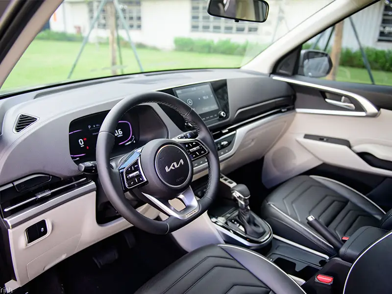 Thiết kế khoang cabin của Kia Carens 2024 gọn gàng, hiện đại với cụm đồng hồ đo kỹ thuật số 12.5” sắc nét, có thể thay đổi giao diện màu theo từng chế độ lái Eco/Normal/Sport  và màn hình trung tâm giải trí cỡ lớn 10.25” kết nối thông minh Apple Carplay không dây/Android Auto tích hợp định vị dẫn đường. Vô lăng 3 chấu thiết kế D cut thể thao tích hợp nhiều phím chức năng.
